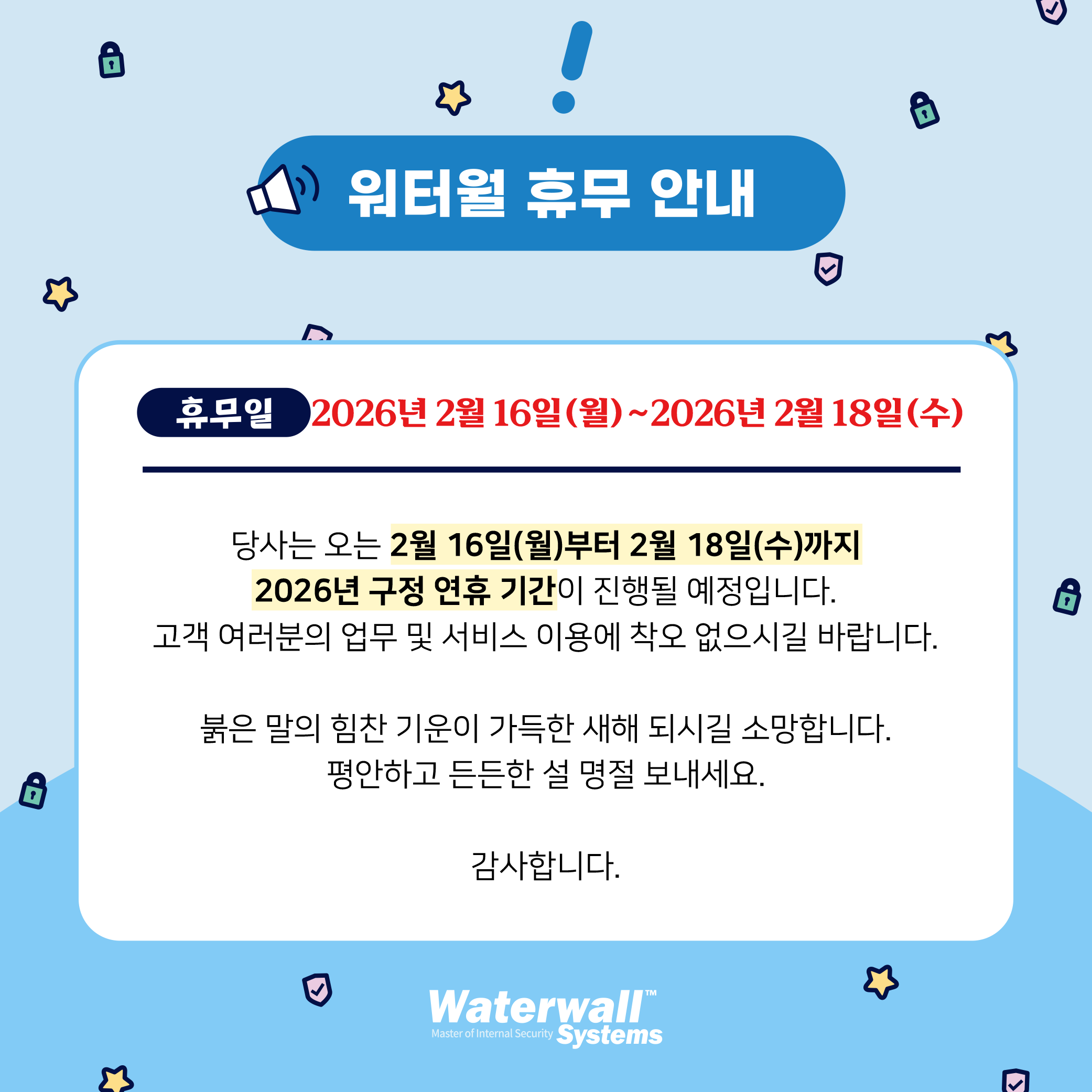 ⭐휴무 안내 : 2026년 2월 16일 월요일 ~ 2026년 2월 18일 수요일⭐ 워터월시스템즈는 오는 2026년 2월 16일(월)부터 2026년 2월 18일(수)까지 2026년 구정 휴무 기간이 진행될 예정입니다. 고객 여러분의 업무 및 서비스 이용에 착오 없으시길 바랍니다. 붉은 말의 힘찬 기운이 가득한 새해 되시길 소망합니다. 평안하고 든든한 설 명절 보내세요. 감사합니다. |