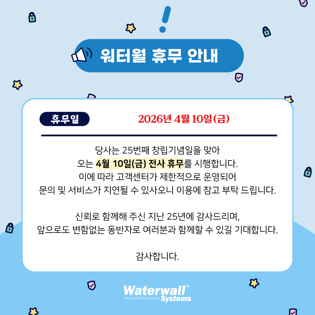 <워터월시스템즈㈜ 창립일 휴무 일정 안내> ⭐휴무 안내 : 2026년 4월 10일 금요일⭐ 당사는 25번째 창립기념일을 맞아 오는 4월 10일(금) 전사 휴무를 시행합니다. 이로 인해 고객센터가 제한적으로 운영되어 문의 및 서비스가 지연될 수 있사오니 이용에 참고 부탁 드립니다. 신뢰로 함께해 주신 지난 25년에 감사드리며, 앞으로도 변함없는 동반자로 여러분과 함께할 수 있길 기대합니다. 감사합니다. |